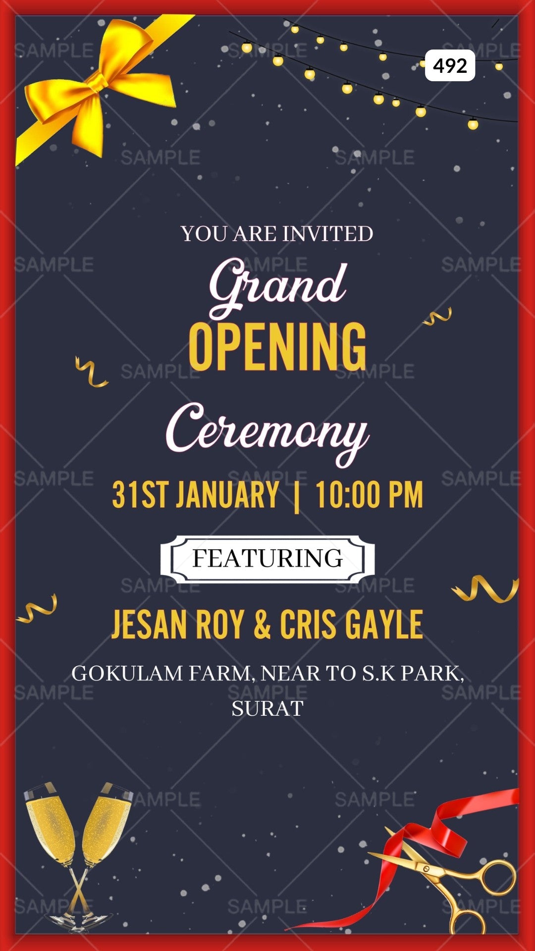 Opening invitation card Canva Editable Template in english language with ribin,scissor as minimalistic theme design 492