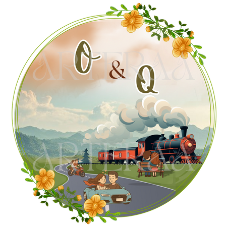 Travel & Train Theme – A whimsical couple’s journey with a scenic train, hills, and floral accents. Great for destination weddings!