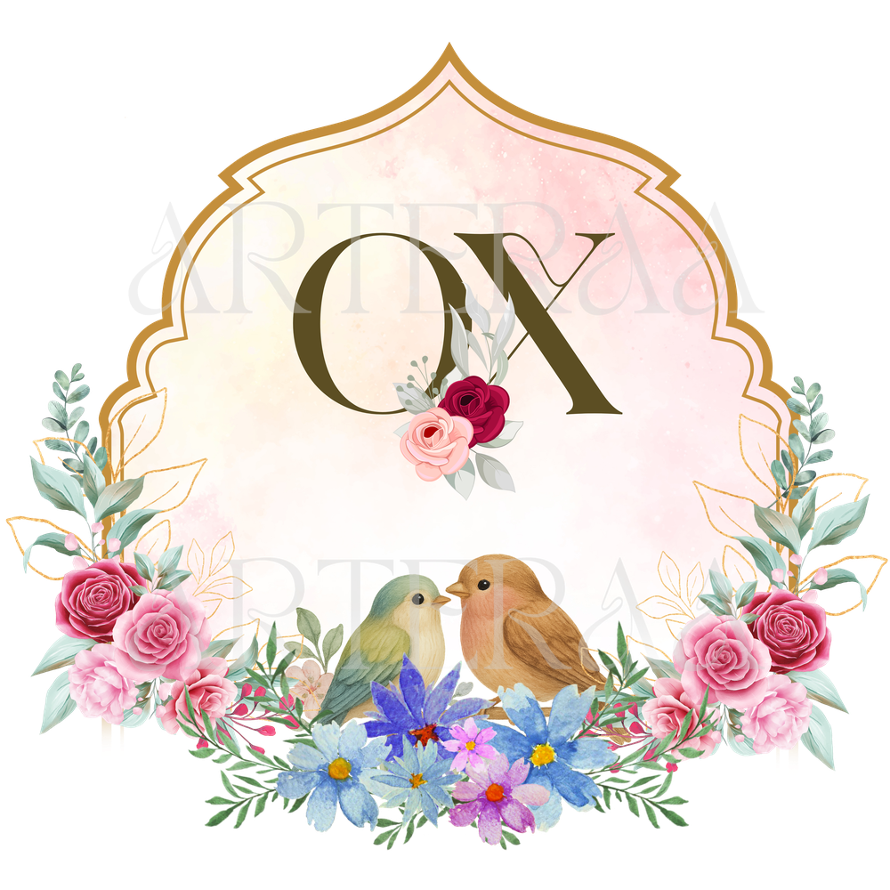 A: You will receive 5 high-resolution PNG files with transparent backgrounds featuring the selected couple initials (e.g., OX). The files are ready to use in digital or printed wedding materials.