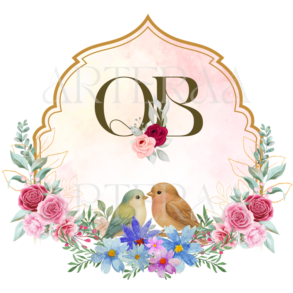 A: You will receive 5 high-resolution PNG files with transparent backgrounds featuring the selected couple initials (e.g., QB). The files are ready to use in digital or printed wedding materials.