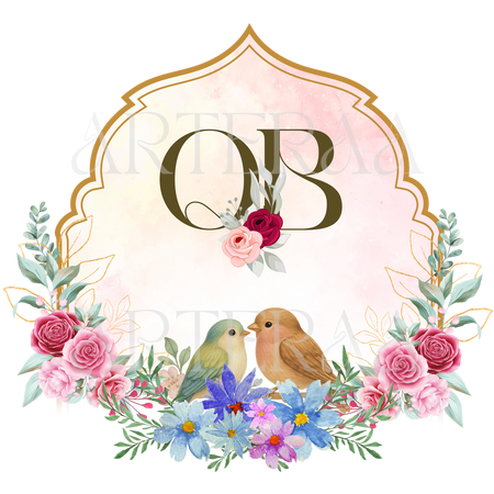 Royal Arch Frame with Love Birds – Luxurious floral arrangement with birds under a Mughal-style arch — perfect for regal invitations.