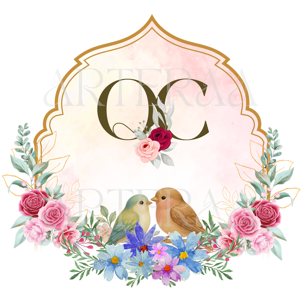 A: You will receive 5 high-resolution PNG files with transparent backgrounds featuring the selected couple initials (e.g., QC). The files are ready to use in digital or printed wedding materials.
