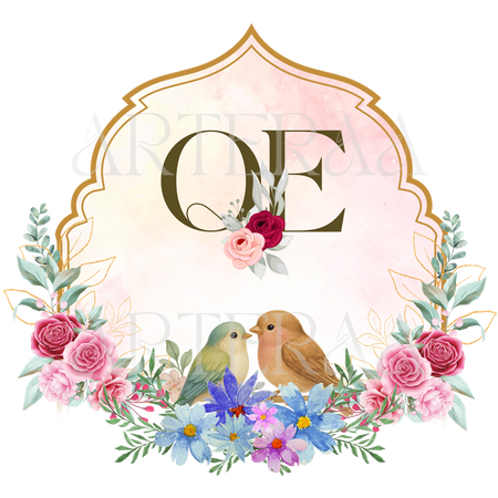 Royal Arch Frame with Love Birds – Luxurious floral arrangement with birds under a Mughal-style arch — perfect for regal invitations.