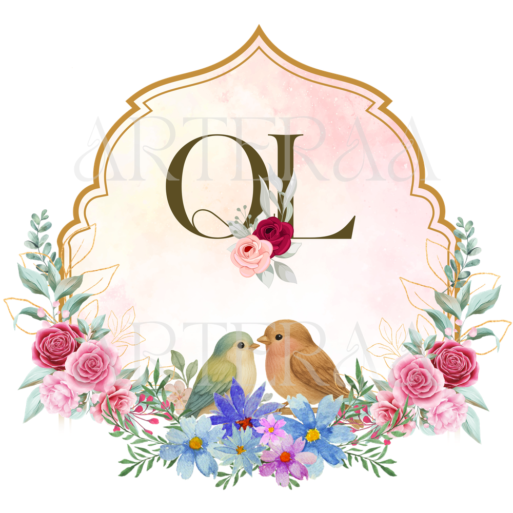 Royal Arch Frame with Love Birds – Luxurious floral arrangement with birds under a Mughal-style arch — perfect for regal invitations.