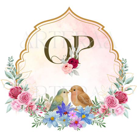 Royal Arch Frame with Love Birds – Luxurious floral arrangement with birds under a Mughal-style arch — perfect for regal invitations.