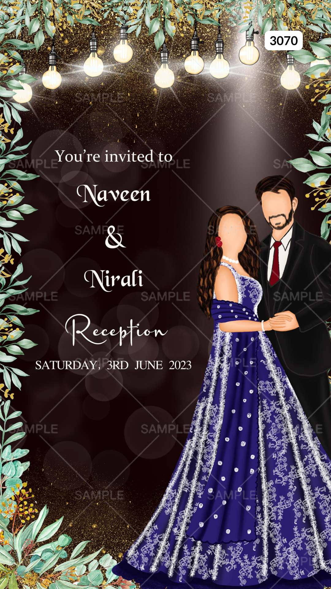 The artistic leaves Theme of the Reception Party digital invitation Editable Canva Template in dark brown background color. This wedding reception ceremony e-invite editable template is available in the English language. This marriage reception invitation includes elements such as bulb, glitter, green leaves, and romantic couple doodle. This card design can be customized online for free in Canva, and you can edit the couple's name, date, time, function name and venue. You can also share your card easily via WhatsApp or email.
