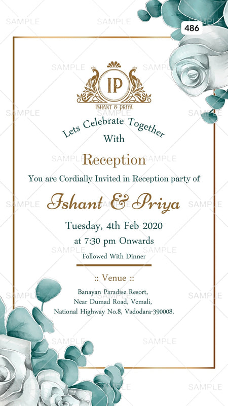 The floral Theme of the Reception Party digital invitation Canva Editable in a white background color. This wedding reception ceremony e-invite editable template is available in the English language. This marriage reception invitation includes elements such as frame, couple logo, flowers, and leaves. This card design can be customized online for free in Canva, and you can edit the couple's name, date, time, function name and venue. You can also share your card easily via WhatsApp or email.