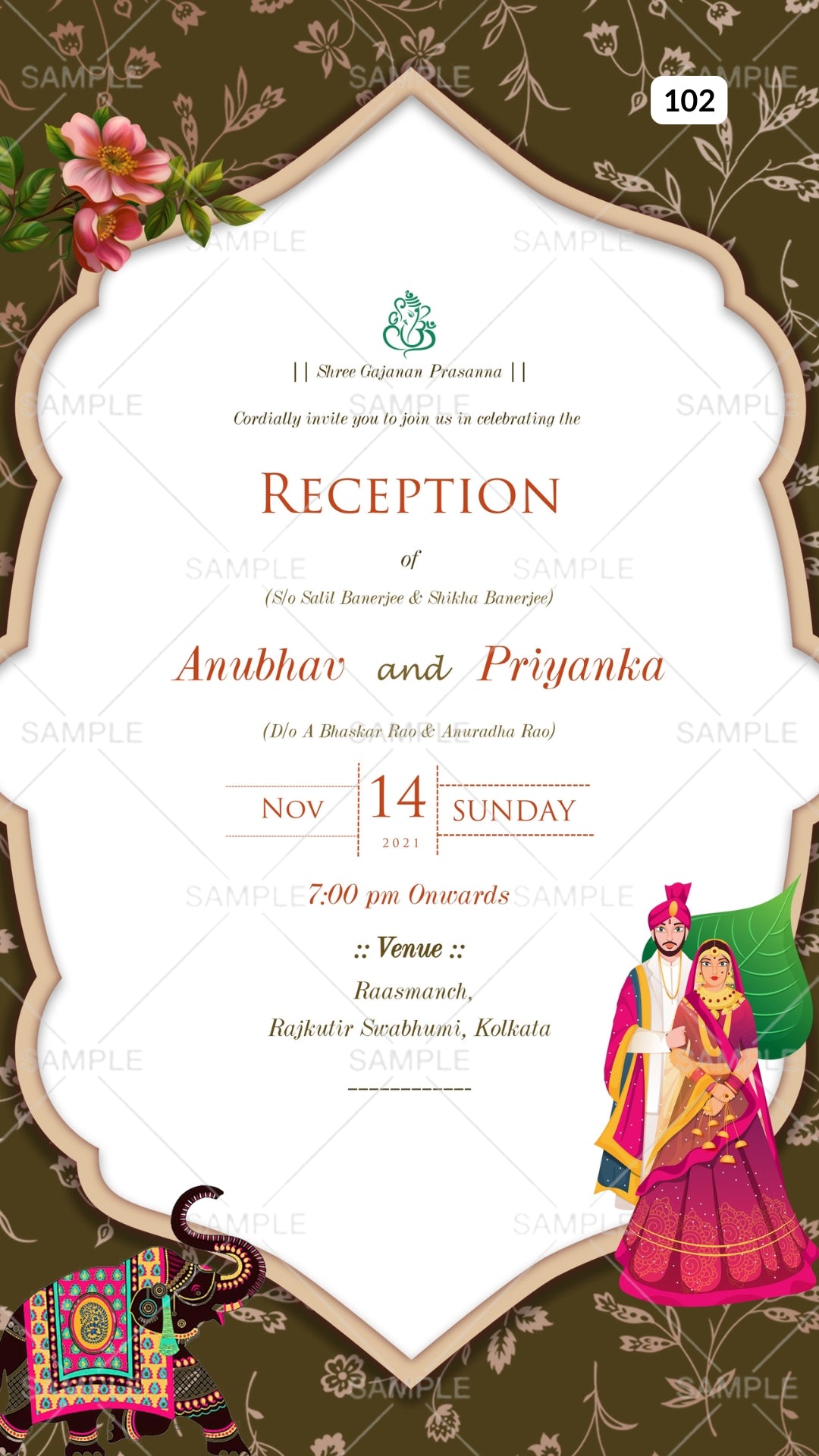 Reception Party invitation card Canva Editable Template in english language with elephant, couple doodle as traditional theme design 102