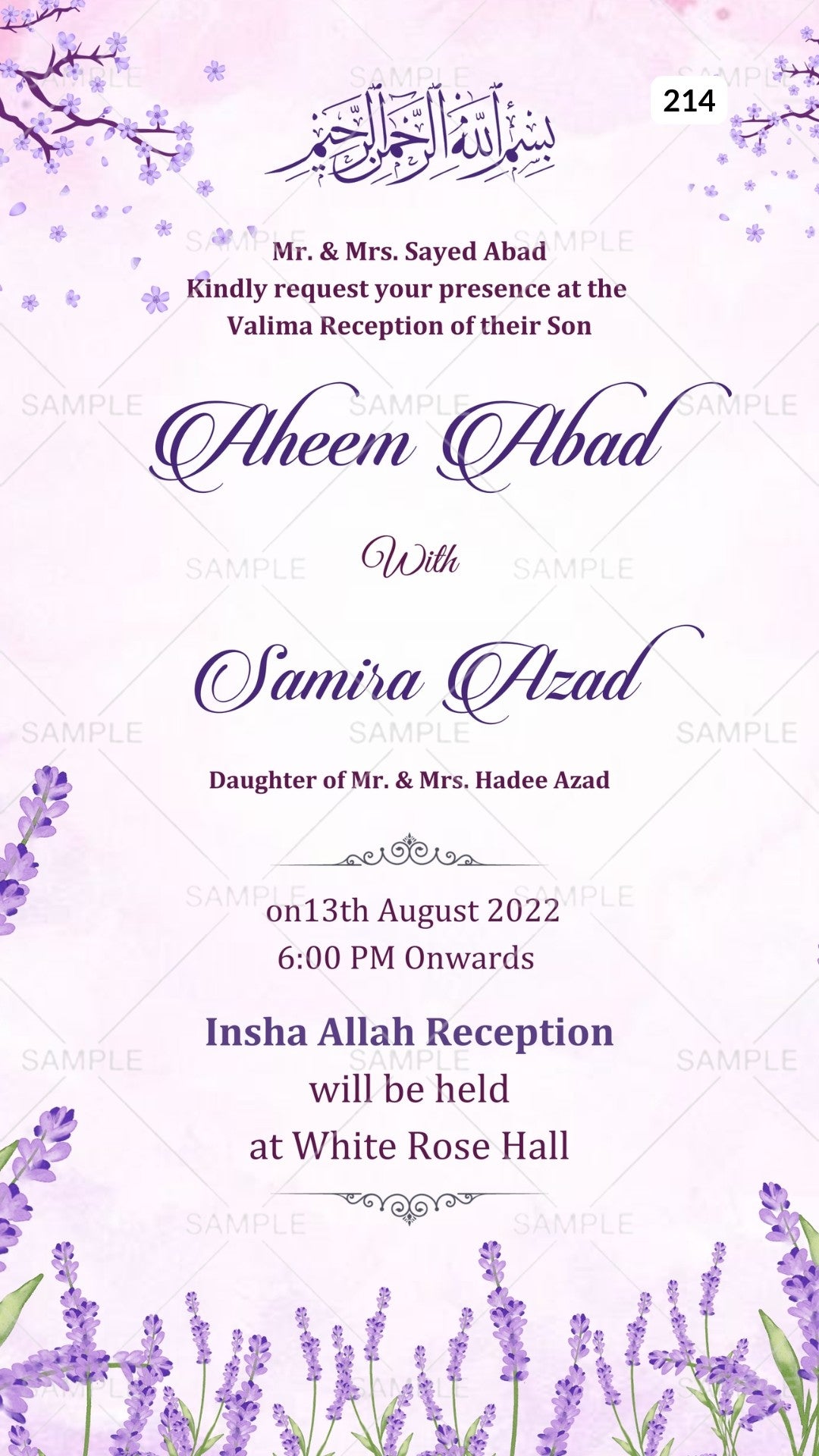 The floral Theme of the Reception Party digital invitation Canva Editable is in lavender background color. This wedding reception ceremony e-invite editable template is available in the English language. This marriage reception invitation includes elements such as purple tulips and Arabic calligraphy. This card design can be customized online for free in Canva, and you can edit the couple's name, date, time, function name and venue. You can also share your card easily via WhatsApp or email.