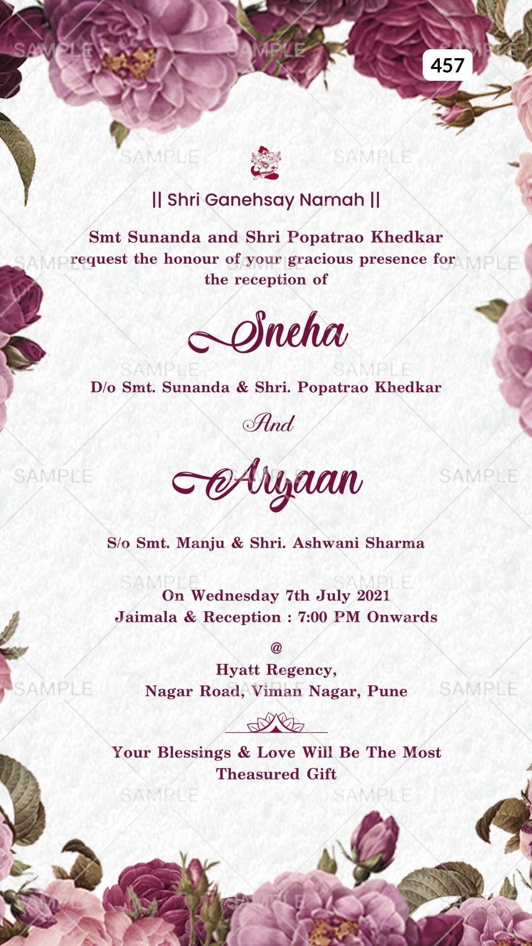 The floral Theme of the Reception Party digital invitation Canva Editable is in light grey textured background color. This wedding reception ceremony e-invite editable template is available in the English language. This marriage reception invitation includes elements such as the Ganesha logo, pink flowers, red flowers, and leaves. This card design can be customized online for free in Canva, and you can edit the couple's name, date, time, function name and venue. You can also share your card easily via WhatsApp or email.