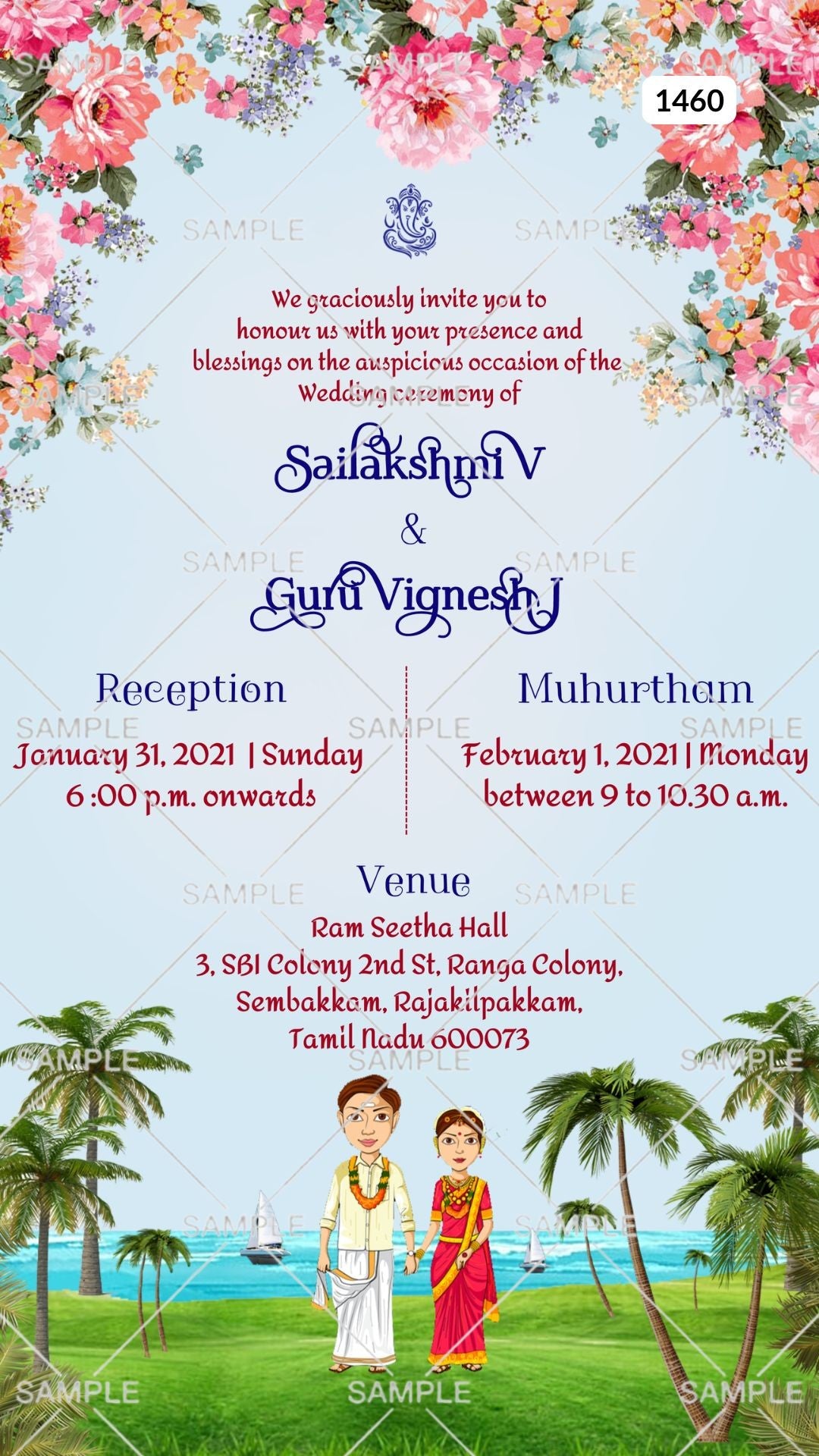 The beach Theme of the Reception Party digital invitation Canva Editable Template in sky blue background color. This wedding reception ceremony e-invite editable template is available in the English language. This marriage reception invitation includes elements such as pink flowers, a Ganesha logo, a couple doodle, coconut tree. This card design can be customized online for free in Canva, and you can edit the couple's name, date, time, function name and venue. You can also share your card easily via WhatsApp or email.
