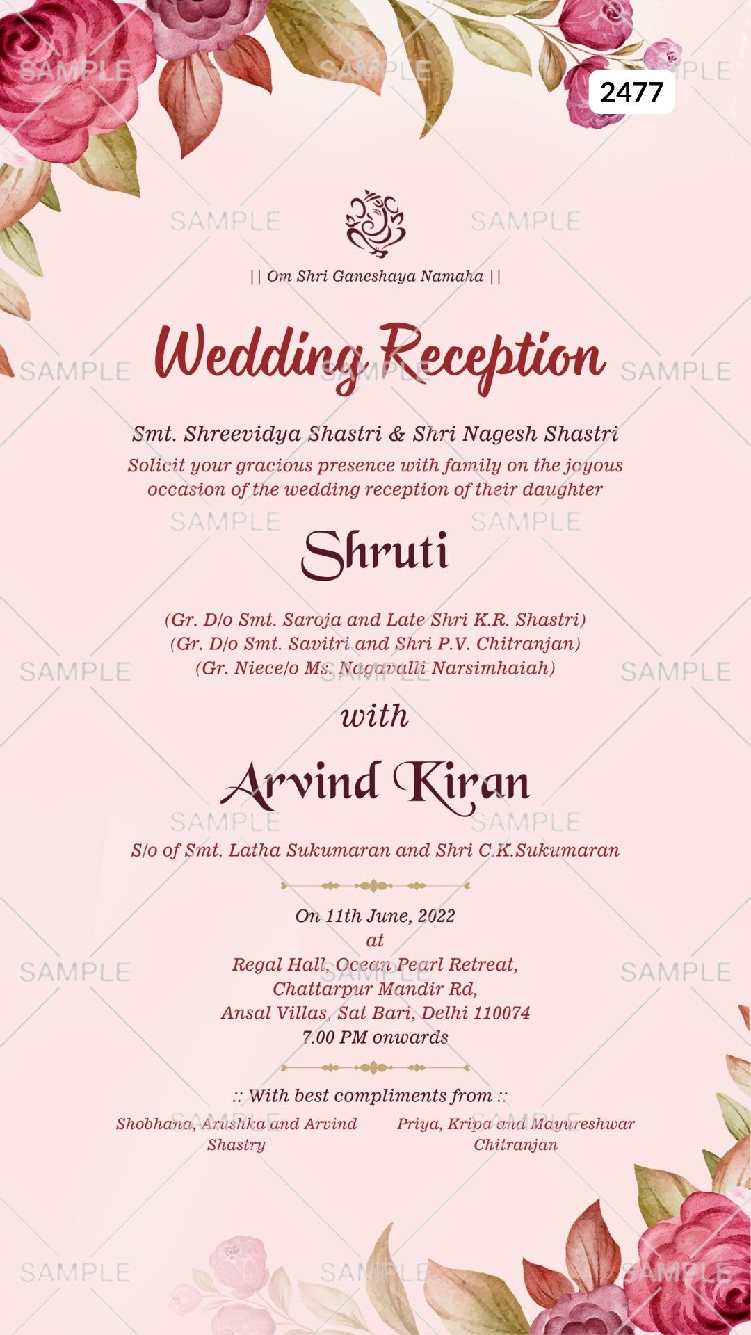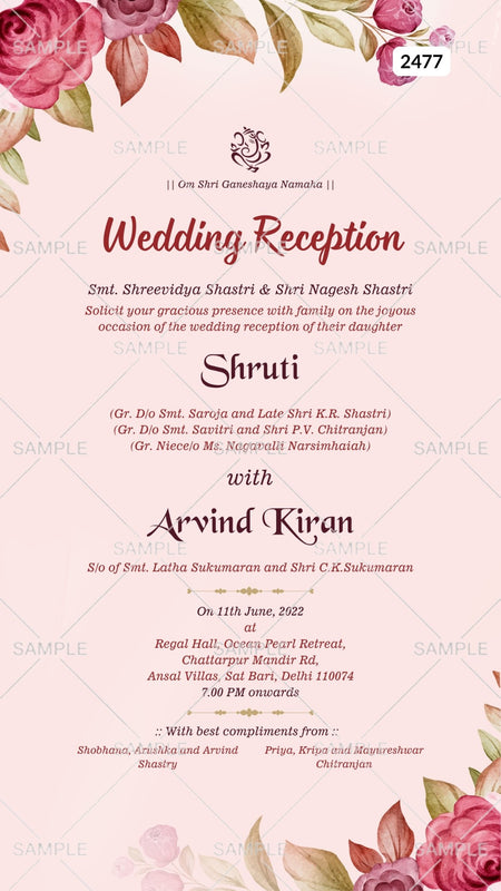 The floral Theme of the Reception Party digital invitation Canva Editable Template is in the light pink background color. This wedding reception ceremony e-invite editable template is available in the English language. This marriage reception invitation includes elements such as flowers, leaves, Ganesha logo. This card design can be customized online for free in Canva, and you can edit the couple's name, date, time, function name and venue. You can also share your card easily via WhatsApp or email.