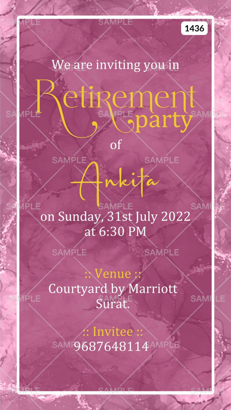 The minimalistic Theme of the Retirement Party digital invitation Canva Editable Template is a pink background color. This Retirement celebration e-invite editable template is available in the English language. It includes elements such as frame. This card design can be customized online for free in Canva, and you can edit the name, date, time, function name and venue. You can also share your card easily via WhatsApp or email.