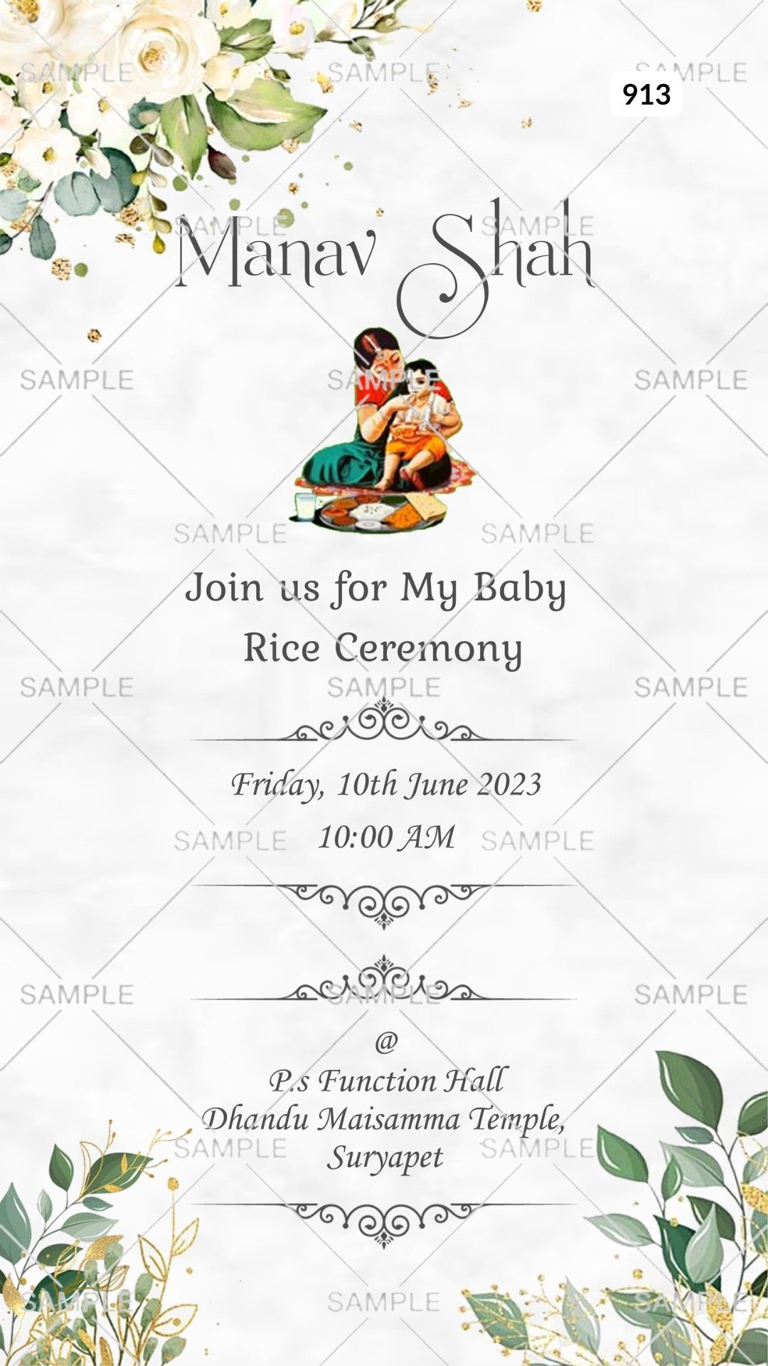 Rice ceremony invitation Canva Editable video Template in english language with leaves as minimalistic theme design 913