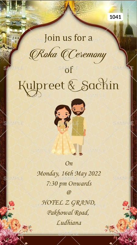 Roka ceremony invitation card Canva Editable Template in Punjabi family in english language with adorable couple doodle as arch theme design 1041