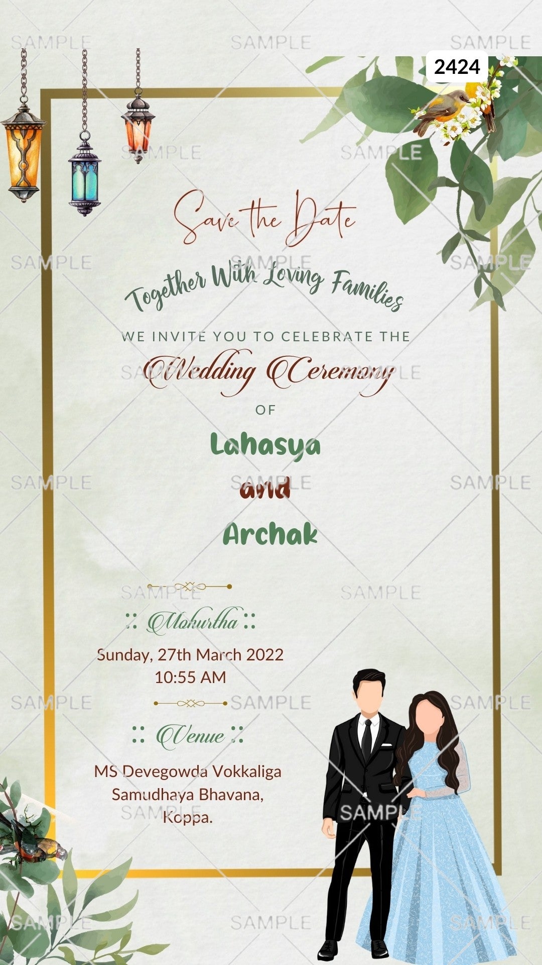 The Pastel green Theme of the Hindu South Indian romantic couple doodle digital invitation Canva Editable Template for wedding ceremony in pastel green background color. This e-invite editable template is perfectly suitable for Kannada family and it's available in English language. It includes elements such as leaves, golden frame, peacock, birds, lantern. This card design can be customized online for free in Canva, and you can edit the couple's name, date, time, function name and venue. You can also share your card easily via WhatsApp or email.