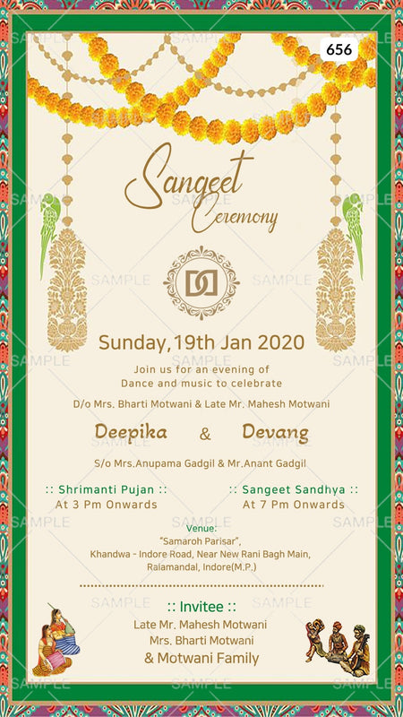 Sangeet Sandhya Ceremony invitation card Canva Editable Template in english language with marigold garland, couple logo as vintage theme design 656