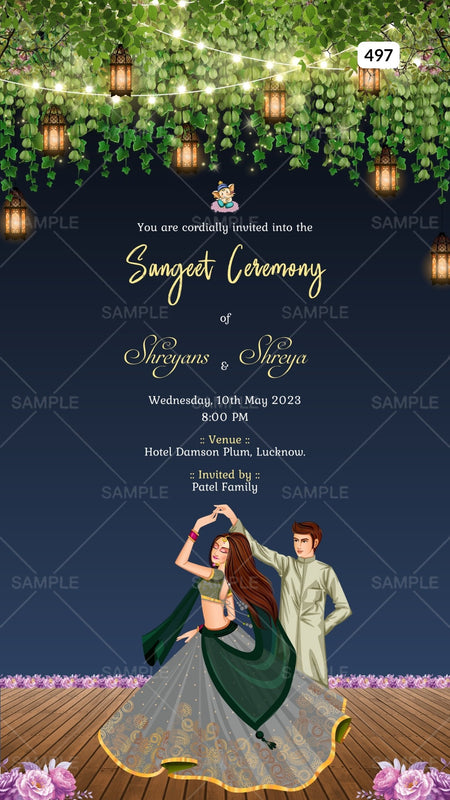 The night view Theme of the Sangeet Sandhya Ceremony digital invitation Canva Editable in blue background color. This Sangeet e-invite editable template is available in the English language. It includes elements such as a lantern, a Ganesha logo, a sangeet couple doodle, string lights, green tulips, and flowers. This card design can be customized online for free in Canva, and you can edit the couple's name, date, time, function name and venue. You can also share your card easily via WhatsApp or email.