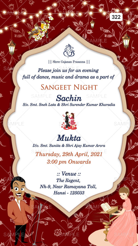 The traditional Theme of the Sangeet Sandhya Ceremony digital invitation Canva Editable in white, and red background color. This Sangeet e-invite editable template is available in the English language. It includes elements such as a couple doodle, string lights, birds, the Ganesha logo, lantern. This card design can be customized online for free in Canva, and you can edit the couple's name, date, time, function name and venue. You can also share your card easily via WhatsApp or email.