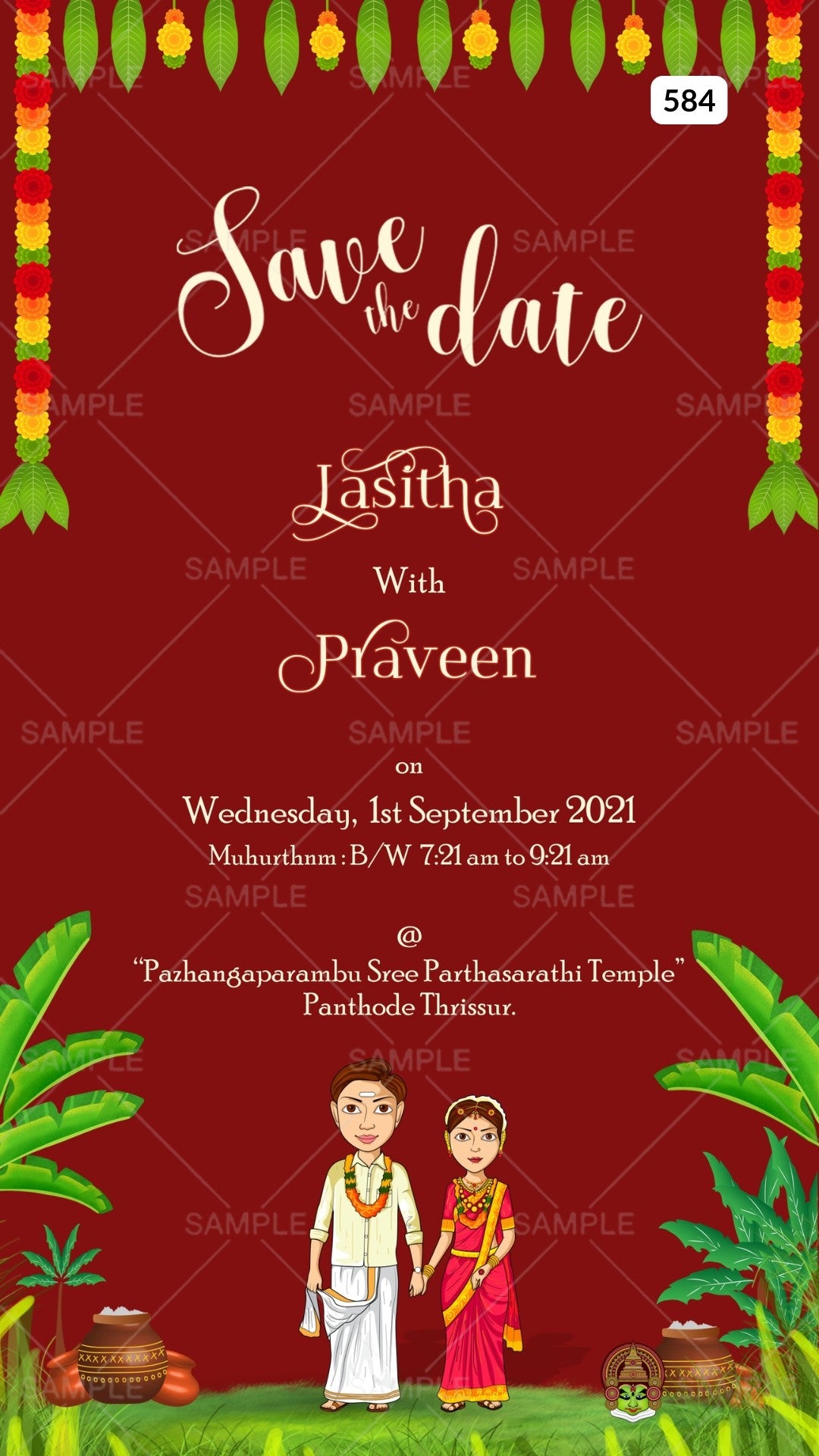 The traditional Theme of the Save the Date digital invitation Canva Editable is in red background color. This e-invite editable template is available in the English language. Save the Date wedding cards include elements such as marigold garland, banana leaves, adorable couple doodle, and kathakali face. This card design can be customized online for free in Canva, and you can edit the couple's name, date and venue. You can also share your card easily via WhatsApp or email.