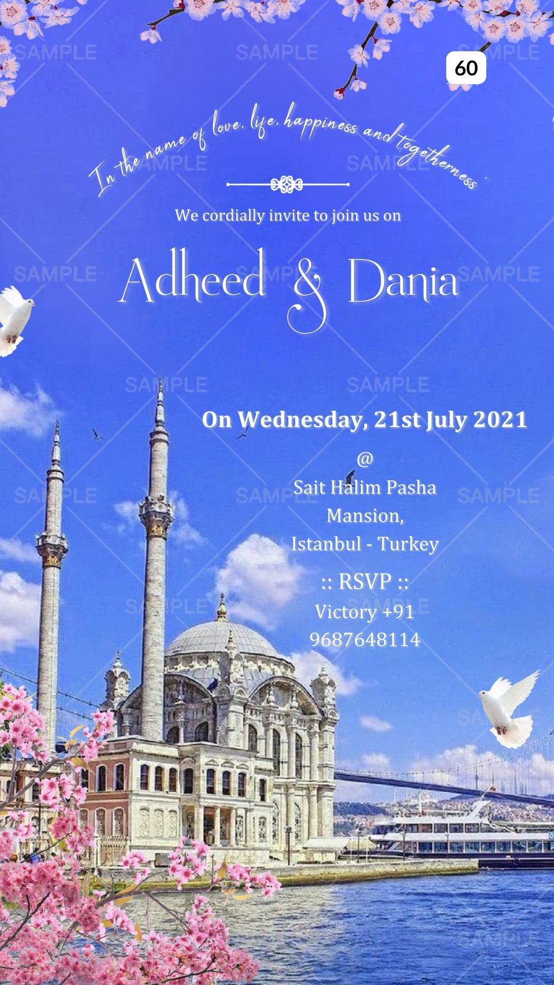 The Spring Theme of Western Islamic Wedding Ceremony Digital Invitation Canva Editable Template in Blue background color. This e-invite card is perfectly suitable for Modern families and is available in the English language. It includes elements such as Pink Flowers, Pigeon, Ortakoy Mosque This card design can be customized online for free in Canva, and you can edit Suitable Quotes, Couple Name, Date, Venue, Mobile Number. You can also share your card easily via WhatsApp or email.