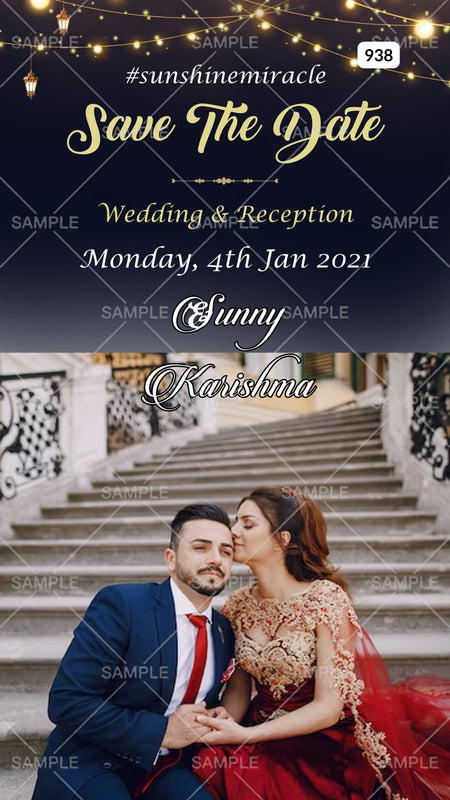 The night Theme of the Save the Date digital invitation Canva Editable is black background color. This e-invite editable template is available in the English language. Save the Date wedding cards include elements such as string lights, and couple photo. This card design can be customized online for free in Canva, and you can edit the couple's name, date and venue. You can also share your card easily via WhatsApp or email.