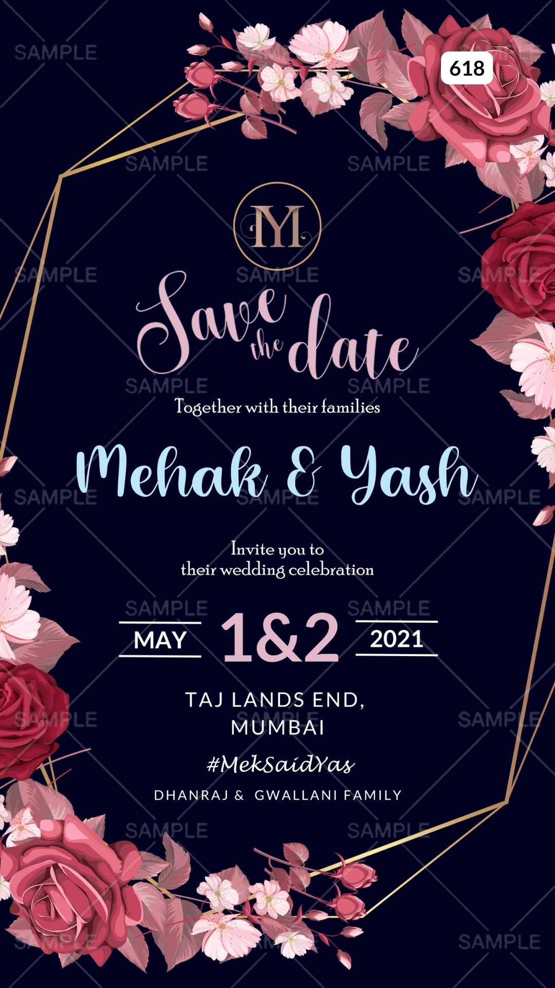 The floral Theme of the Save the Date digital invitation Canva Editable in the blue background color. This e-invite editable template is available in the English language. Save the Date wedding cards include elements such as red flowers, leaves, frame., and couple logo. This card design can be customized online for free in Canva, and you can edit the couple's name, date and venue. You can also share your card easily via WhatsApp or email.