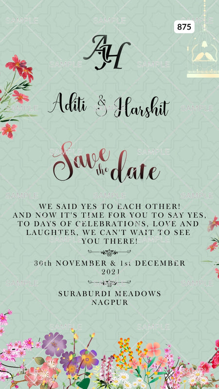 Save the Date card Canva Editable Template in english language with flowers, couple logo as floral theme design 875