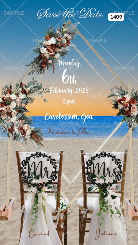 The beach Theme of Save the Date digital invitation Canva Editable Template in sky blue background color. This e-invite editable template is available in the English language. Save the Date wedding cards include elements such as a couple chair, flowers, and frame. This card design can be customized online for free in Canva, and you can edit the couple's name, date and venue. You can also share your card easily via WhatsApp or email.