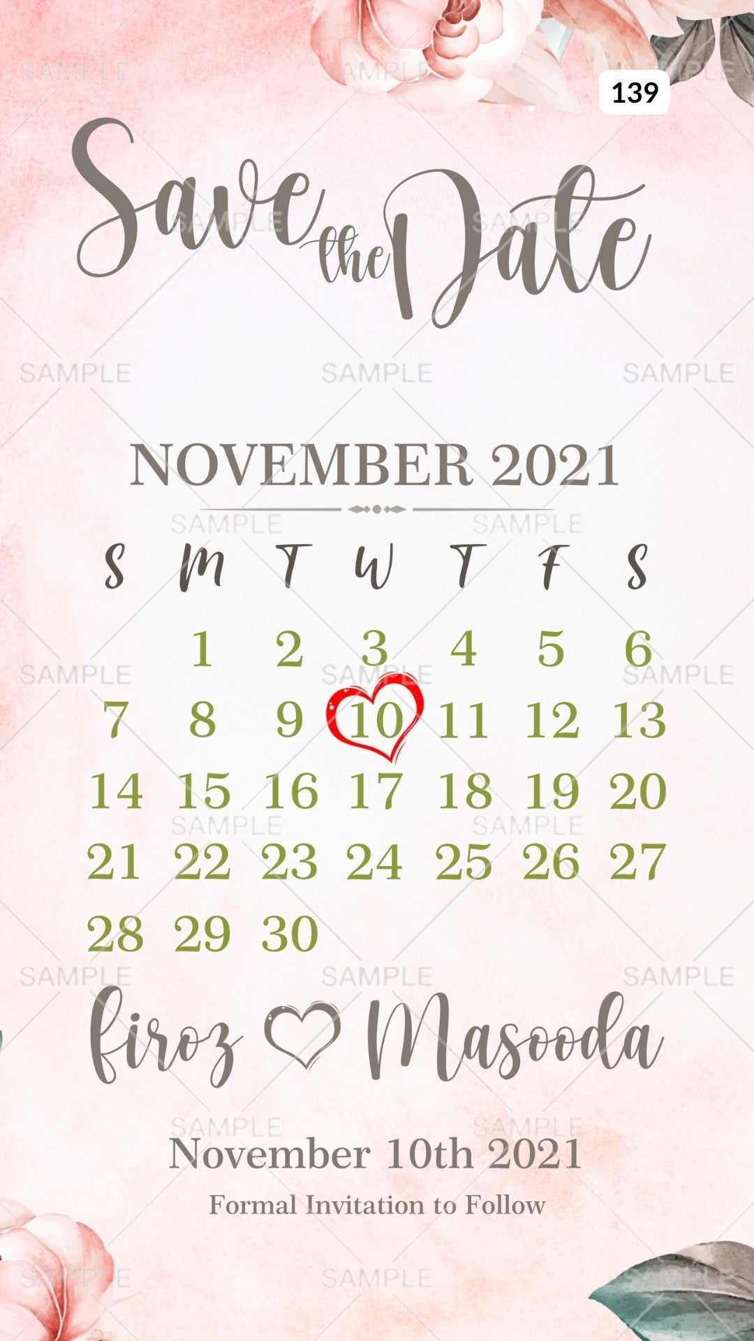 The floral Theme of the Save the Date digital invitation Canva Editable in the pink background color. This e-invite editable template is available in the English language. Save the Date wedding cards include elements such as flowers, calendar, and leaves. This card design can be customized online for free in Canva, and you can edit the couple's name, date and venue. You can also share your card easily via WhatsApp or email.