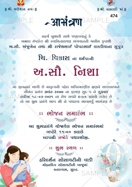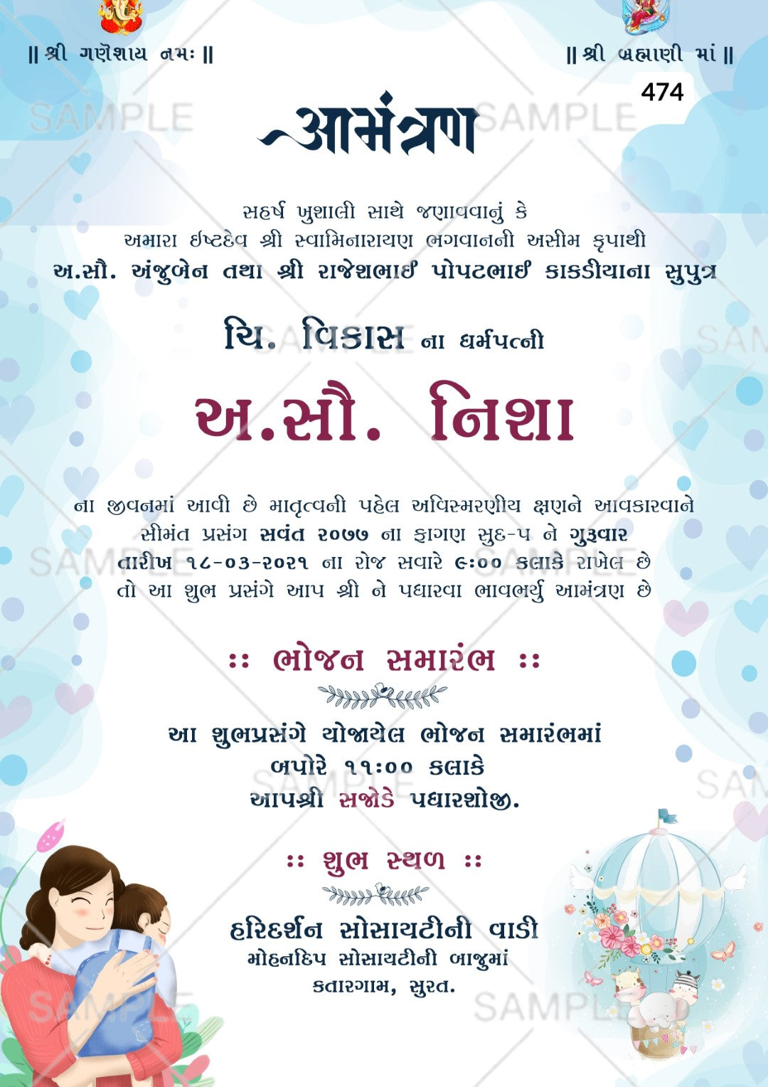 The playful Theme of the simant vidhi Baby Shower ceremony digital editable invitation card in the white background color. This Simant Sanskar e-invite card is available in Gujarati language. Shrimant / Srimat card includes elements such as toran, couple photo, balloons, star, Ganesha logo, hot air balloons, and doodle.