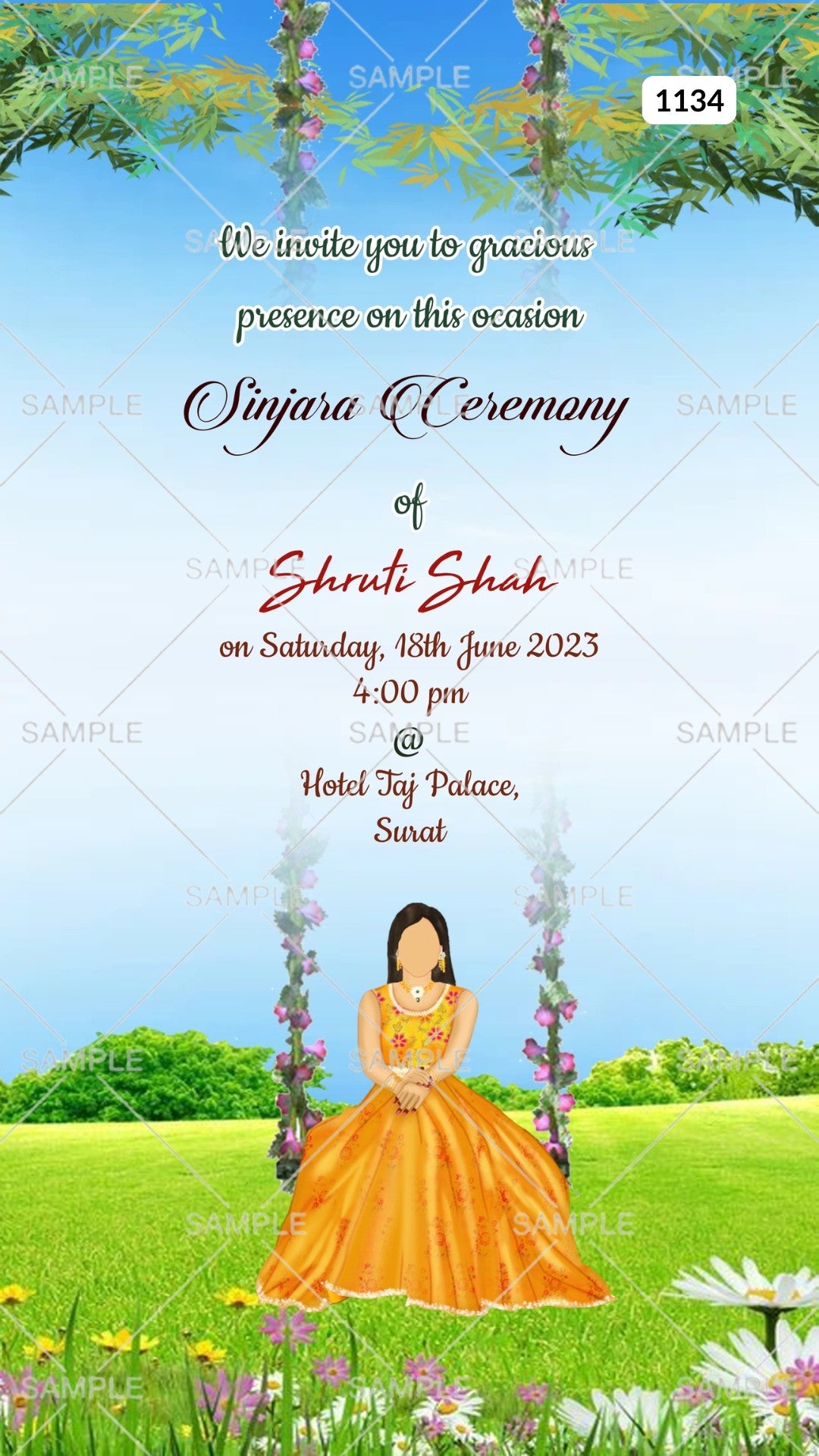 Sinjara ceremony invitation card Canva Editable Template in english language with girl doodle, flowers as garden theme design 1134