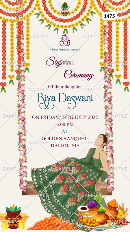 Sinjara ceremony invitation card Canva Editable Template in english language with marigold garland, girl doodle as traditional theme design 1475