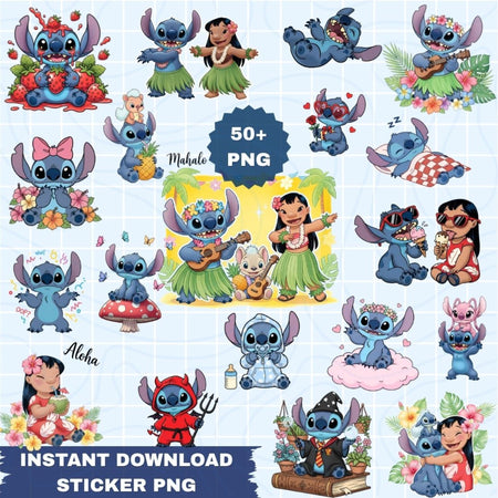 Stitch & Lilo Cartoon PNG Bundle | 50+ Ohana Sublimation Designs | Digital Sticker Pack | Instant Download - C26