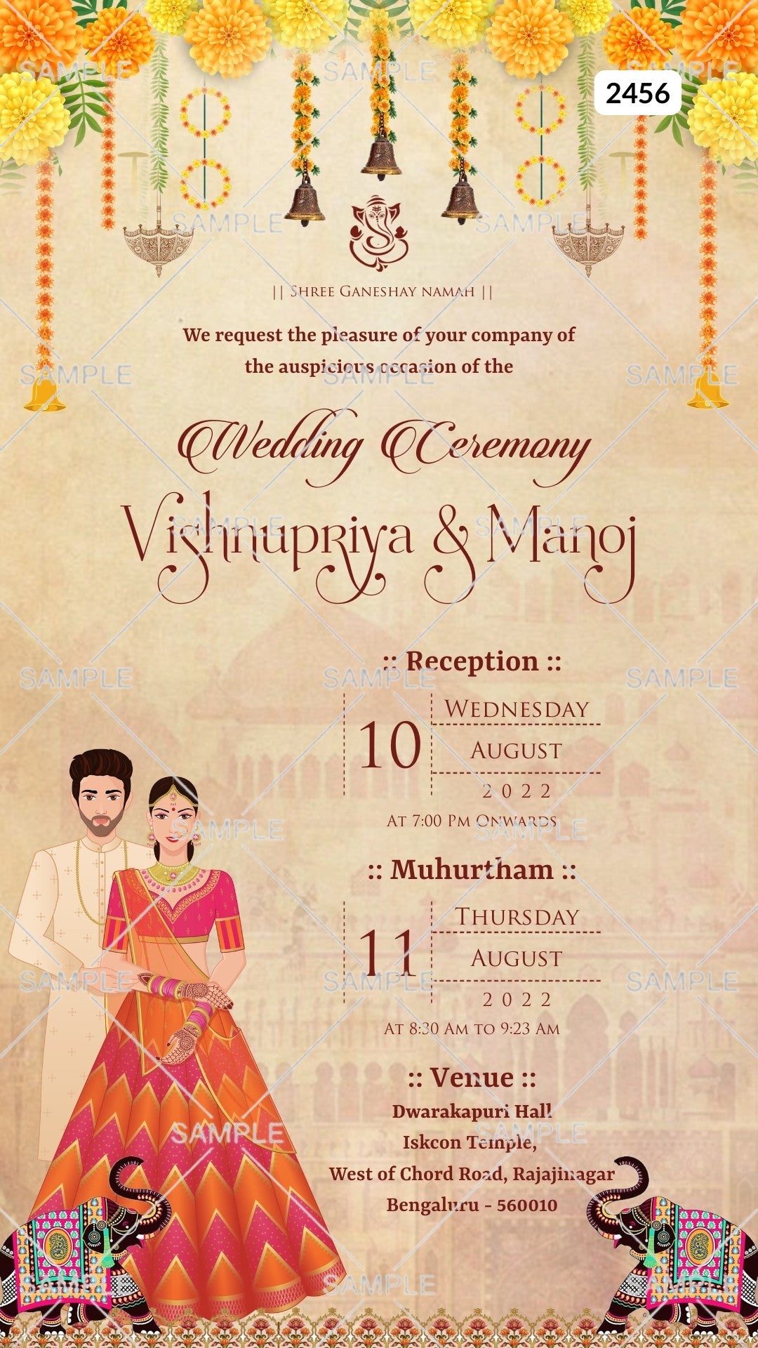 Stylish couple doodle digital invitation card Canva Editable Template for wedding ceremony of hindu south indian Kannada family in english language with Marigold theme design 2456