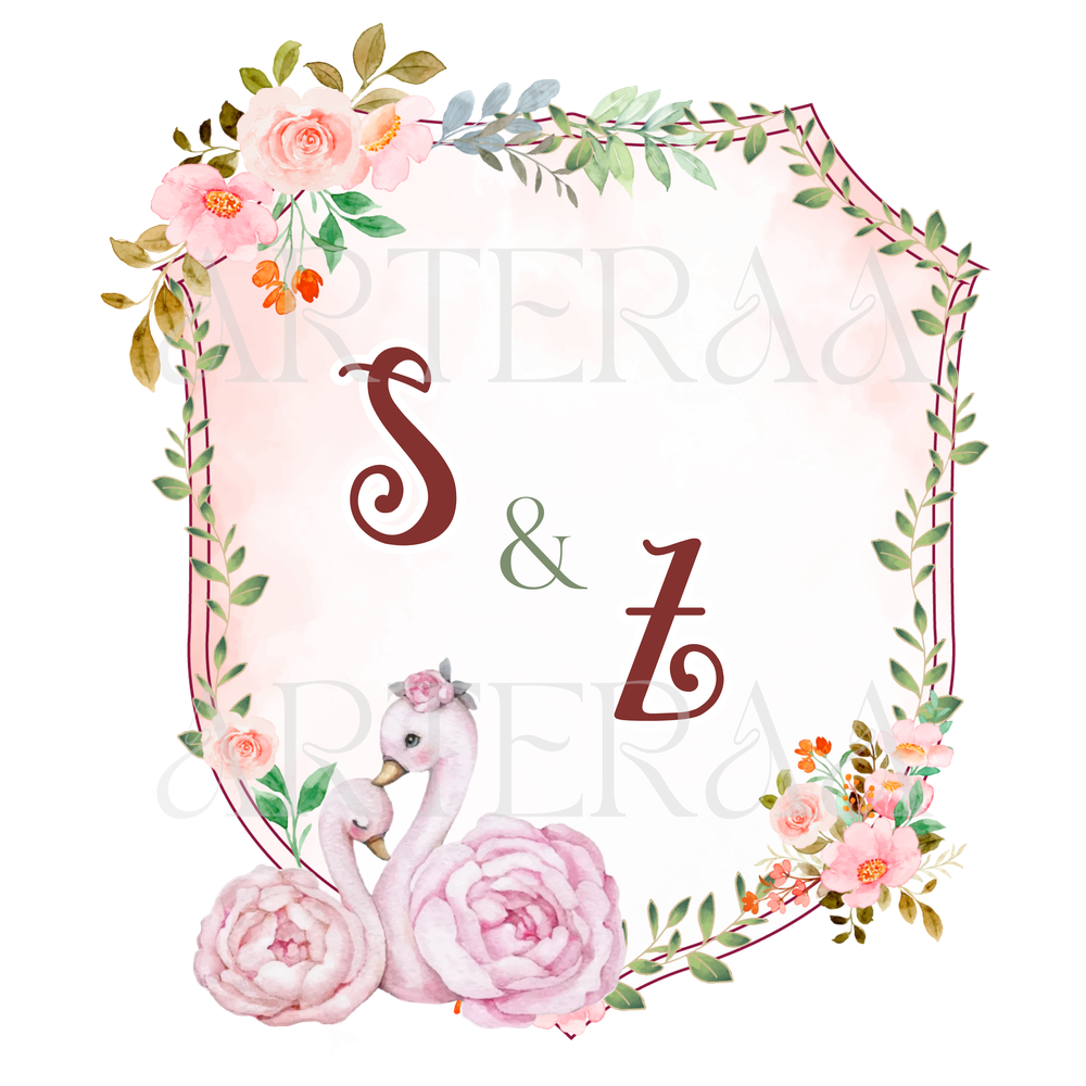 Floral Swan Monogram – Gentle pastel pinks, floral frame, and a pair of swans for an elegant romantic vibe.