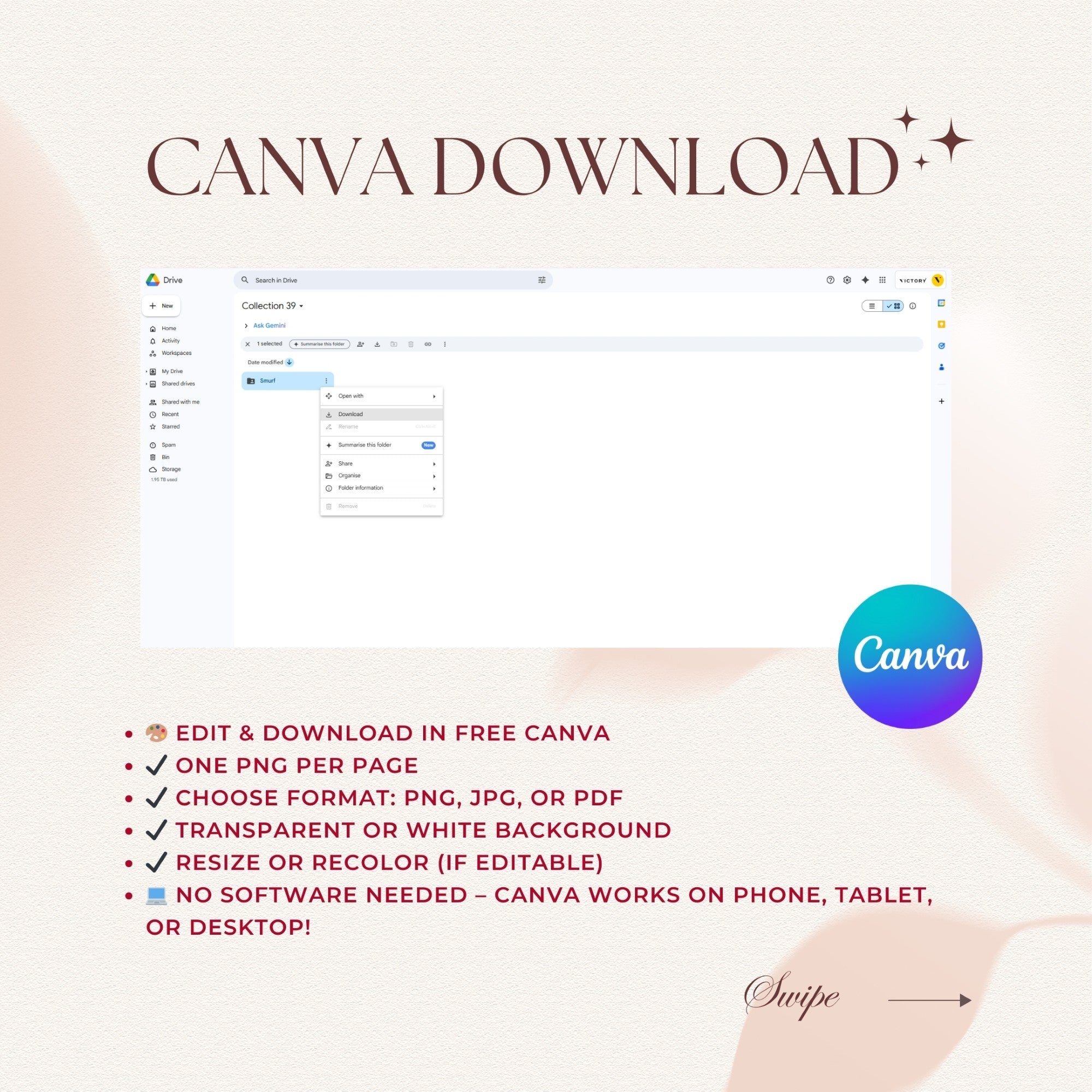 • Reselling or sharing the PNG files, Canva link, or Drive link