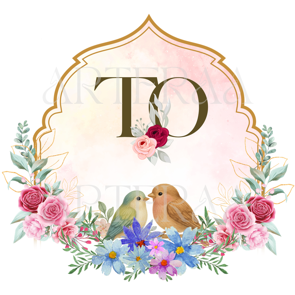 A: You will receive 5 high-resolution PNG files with transparent backgrounds featuring the selected couple initials (e.g., TO). The files are ready to use in digital or printed wedding materials.