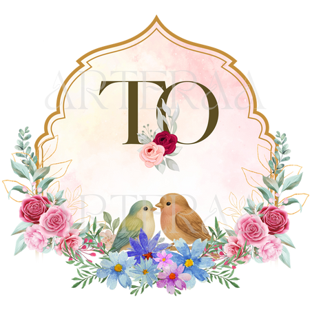 Royal Arch Frame with Love Birds – Luxurious floral arrangement with birds under a Mughal-style arch — perfect for regal invitations.