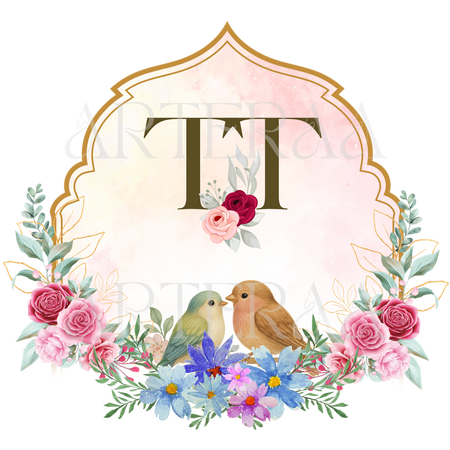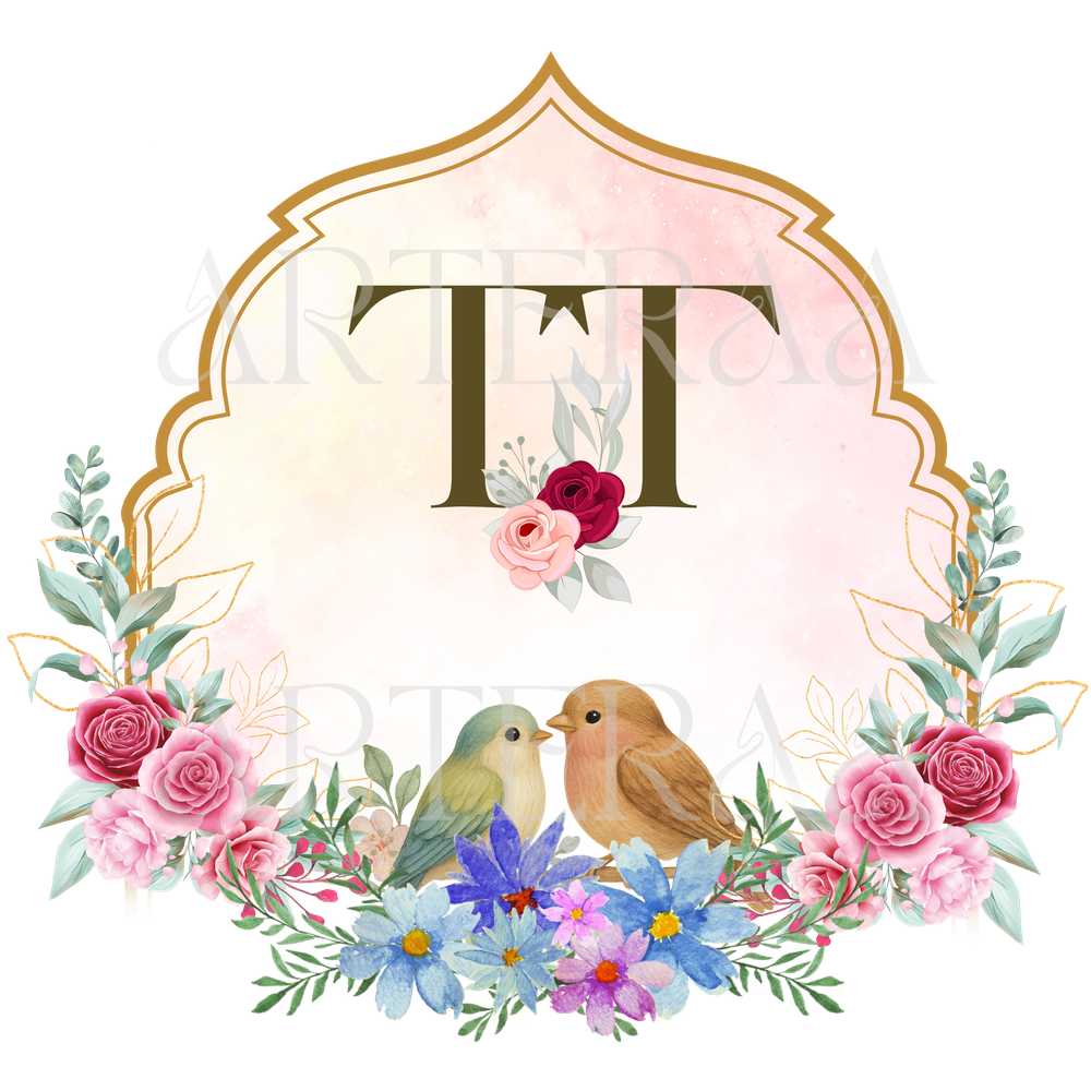 A: You will receive 5 high-resolution PNG files with transparent backgrounds featuring the selected couple initials (e.g., TT). The files are ready to use in digital or printed wedding materials.