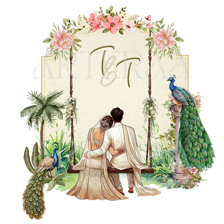 Traditional Indian Couple on Swing – Illustrated bride and groom sitting on a jhula surrounded by flowers and peacocks – timeless and cultural.