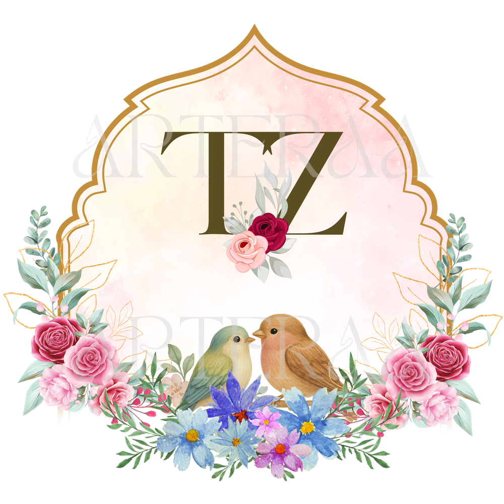 A: You will receive 5 high-resolution PNG files with transparent backgrounds featuring the selected couple initials (e.g., TZ). The files are ready to use in digital or printed wedding materials.
