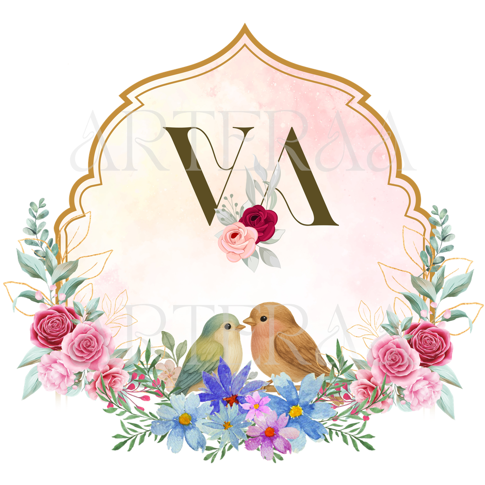 A: You will receive 5 high-resolution PNG files with transparent backgrounds featuring the selected couple initials (e.g., VA). The files are ready to use in digital or printed wedding materials.
