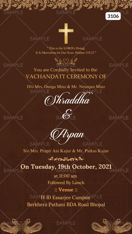 The minimalistic Theme of the Vachandatt Ceremony digital invitation Editable Canva Template is a brown background color. This e-invite editable template is for catholic family and it's available in English language. It includes elements such as the Christian cross symbol, vintage peacock, and flower pattern. This card design can be customized online for free in Canva, and you can edit the couple's name, function name, date, time, venue, and regards. You can also share your card easily via WhatsApp or email.