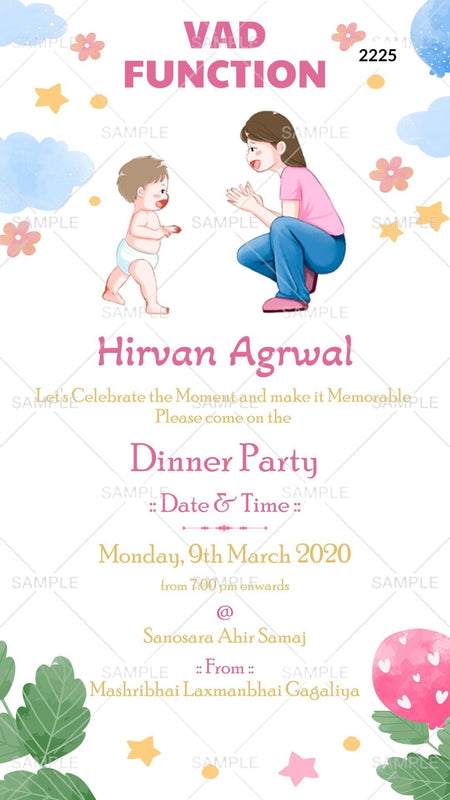 The minimalistic Theme of the Vad Ceremony digital invitation Canva Editable Template is white background color. This e-invite editable template is available in the English language. It includes elements such as balloons, cloud, leaves, and doodle. This card design can be customized online for free in Canva, and you can edit the name, function name, date, time, venue, and regards. You can also share your card easily via WhatsApp or email.