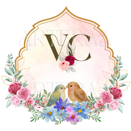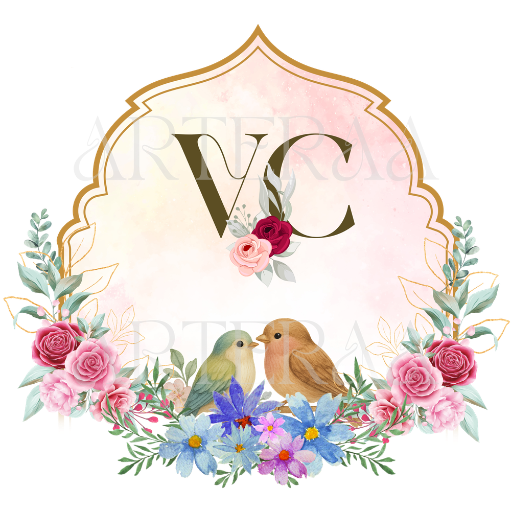 A: You will receive 5 high-resolution PNG files with transparent backgrounds featuring the selected couple initials (e.g., VC). The files are ready to use in digital or printed wedding materials.