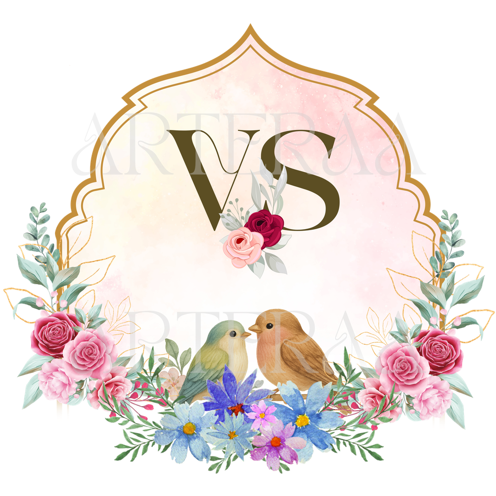 A: You will receive 5 high-resolution PNG files with transparent backgrounds featuring the selected couple initials (e.g., VS). The files are ready to use in digital or printed wedding materials.
