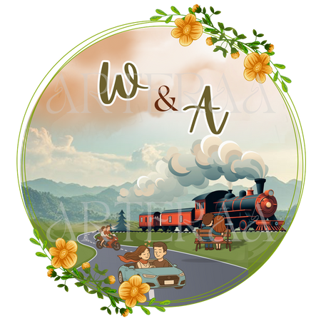 Travel & Train Theme – A whimsical couple’s journey with a scenic train, hills, and floral accents. Great for destination weddings!