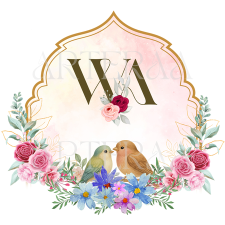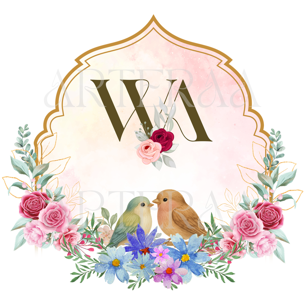 A: You will receive 5 high-resolution PNG files with transparent backgrounds featuring the selected couple initials (e.g., WA). The files are ready to use in digital or printed wedding materials.