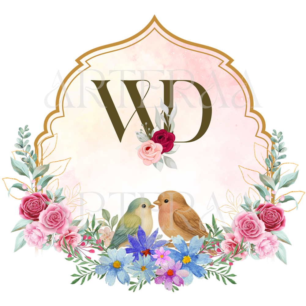 A: You will receive 5 high-resolution PNG files with transparent backgrounds featuring the selected couple initials (e.g., WD). The files are ready to use in digital or printed wedding materials.